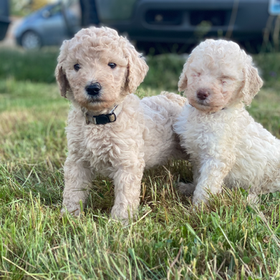 Mochi and Moxie are both multigenerational, non-shedding labradoodles. They are super smart, loving, social, active dogs with gentle temperaments. Both parents love the water, playing outside, and are always up for an adventure. Inside the house, they are completely trustworthy and well behaved. They love meeting new people, and get along well with other dogs and the animals on our farm. Both have been Embark Breeder DNA health-screened with no issues. Dad is 55 lb and mom is 45. Their puppies have ranged from 38-60 lbs full-grown. We're happy to send you their DNA health screening results (PDF) upon request. Mochi is registered with the Continental Kennel Club (CKC): 1931572-2. Pups can be CKC registered based on parental DNA results if you wish.